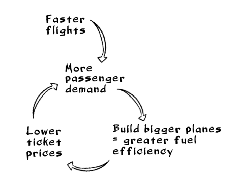 There’s also a tipping point at which the fastest flight actually becomes the cheapest one. Because the faster you go, the more flights you can do with the same airplane, with the same crew. I call it the speed dividend — when things are faster, you get savings. That’s going to push us to a point where faster airplanes actually have an economic advantage over slow ones.