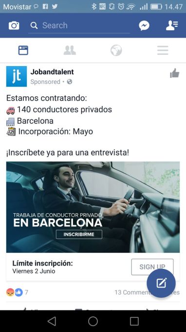 Meanwhile, both companies are continuing to recruit drivers — using another Spanish startup, Jobandtalent, to help them do so. For example, the below ad running on Facebook in Barcelona says the recruitment firm is looking for 140 private drivers in the city this month, with applications for the roles ending on June 2.