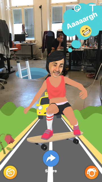 The team is also working on adding further post-processing features such as “beautify filters”, according to Häkkinen. And is developing augmented reality surface detection to enable the 3D characters to “snap to different surfaces within the world”. At the moment the animated figures just float in the middle of the screen or wherever you generally position them.