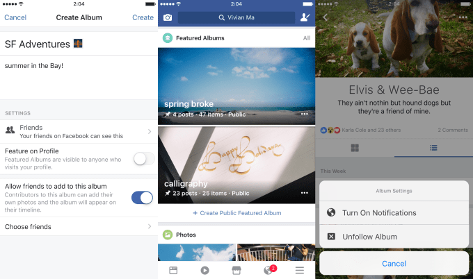 Facebook is revamping its photo album feature with the ability to add videos, check-ins, text posts to albums, follow friends’ albums so you’re notified when they’re updated, and display “featured” albums on your profile to highlight your favorite collections. Facebook is also simplifying the ability to add contributors to a collaborative album, which was an option added in 2013 but deeply buried in the product.