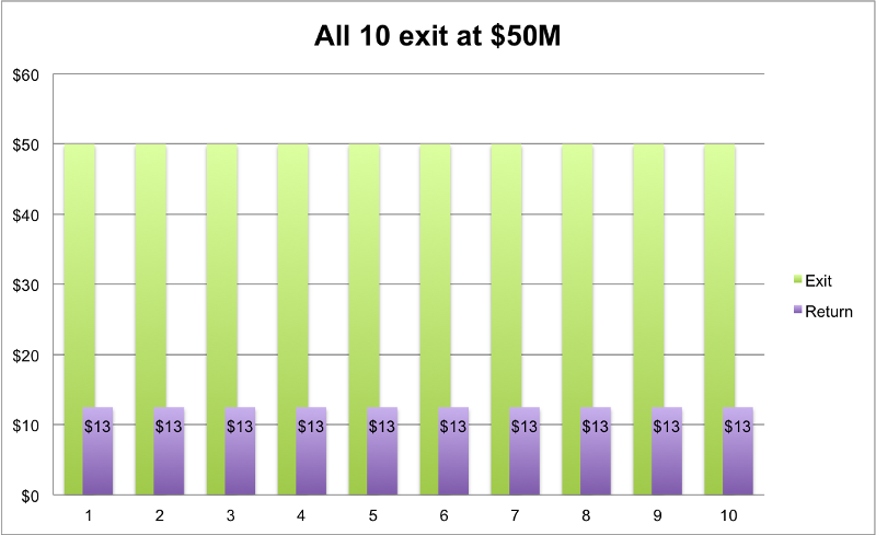 Ten companies, they all exit at $50 million. The VC would return $12.5 million on each. Outcome: 10 * $12.5 million = $125 million. We needed $300 million, right? Not good. Let’s give them better odds.
