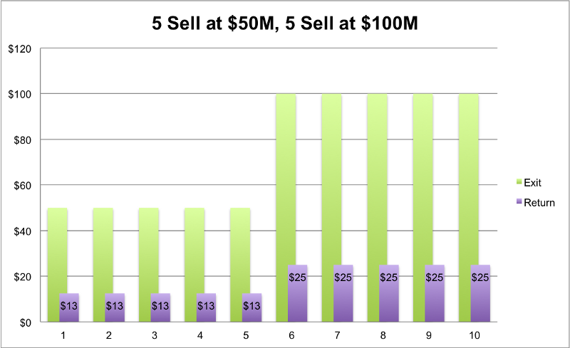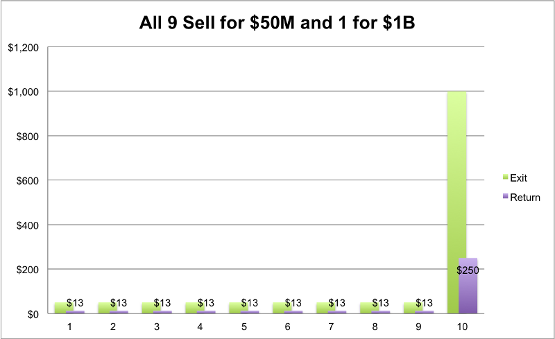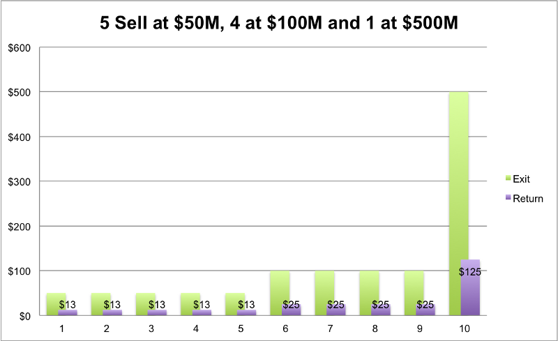 Five sold at $50 million, so $12.5 million return on each. The other five did much better and pulled off $100 million exits. The founders are overnight millionaires and their picture is in the paper. The VC? Not so much. Return: (5 * $12.5 million) + (5 * $25 million) = $187.5 million return. Still not quite at $300 million. No good.