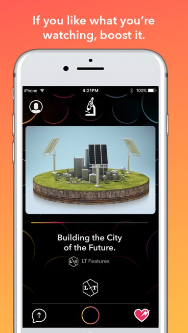 These short-form videos are played in a stream that’s further customized by things like what time of day it is, your interests, what’s trending on Rheo, as well as your own behavior – meaning, what you’ve previously watched, skipped, boosted (a vote up type mechanism), and shared to social networks.