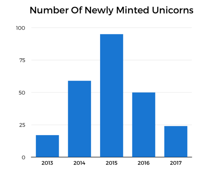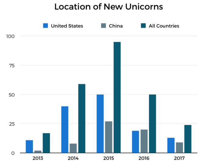 Historically, the lion’s share of unicorns have been U.S.- or China-based, so 2017 doesn’t represent a notable deviation from the norm. Out of 231 companies on the unicorn board, 121 are headquartered in the U.S. and 66 are based in China.