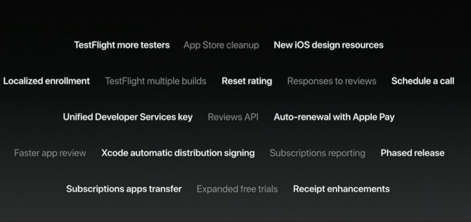 There are a slew of under-the-hood features arriving in the new store, too, but Apple just teased these briefly on a single slide. But a quick peek at that slide shows the features Apple thought to highlight, like support for more TestFlight users, auto-renewal with Apple Pay, receipt enhancements, new design resources and more.