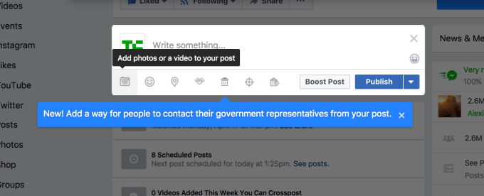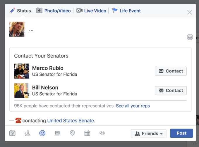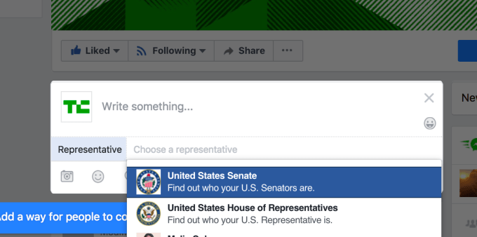 Before now, these sorts of Town Hall features were only available to those who were already engaging with their government representatives on Facebook, or who were actively seeking their reps’ information. With the new integration into the “Compose” box, users who may have otherwise been just sharing their own personal, political opinions may now be encouraged to take action — and prompt others to do so, as well.