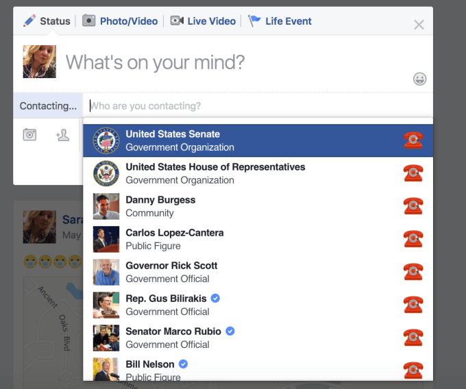 Town Hall officially launched to all U.S. users in March, where it’s available from Facebook’s menu navigation, as well as through various integrations with the News Feed. For example, Facebook previously introduced a feature that invites you to call, message or email your rep when you like or comment on one of their posts. You could then share a post to your own profile alerting your friends of your political action.