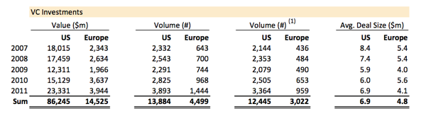Over 2007-2011, European venture started to accelerate. Of course, the industry remained a fraction of the U.S. in size, but by 2011 there were 1,400+ European investments made versus just under 4,000 in the U.S., a healthy jump in activity. And average round size was nearly $5 million versus $7 million for the U.S. — all indicative of a European VC industry developing rapidly from a much smaller base.