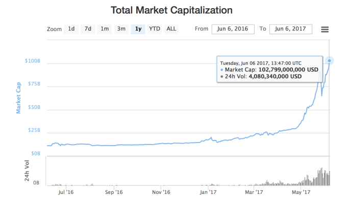 The total market cap for all cryptocurrencies just surpassed $100 billion. The vast majority of these gains have come in just the last few months — on April 1st the total market cap was just over $25 billion — representing a 300 percent increase in value in just over 60 days.