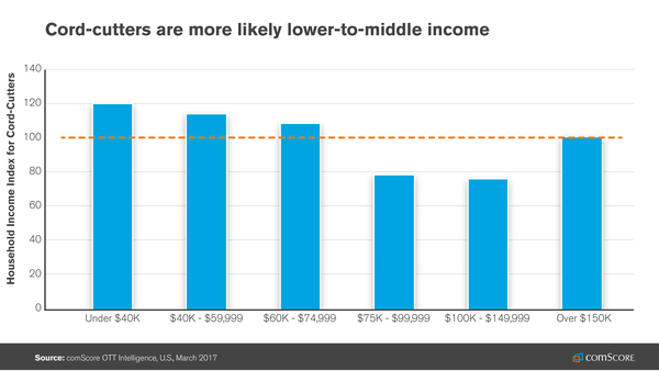 Those least likely to have cut the cord are homes with household incomes between $75,000 and $150,000. Meanwhile, homes with less than $40,000 in annual income are 20 percent more likely to have cut the cord.