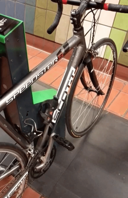 The sturdy metal locking mechanism fits around most bicycles. I tested my larger e-bike and was able to make it work, though I couldn’t manage to get both my frame and wheel locked simultaneously. Another bystander tried to lock his mini foldable bike and faced a similar situation.