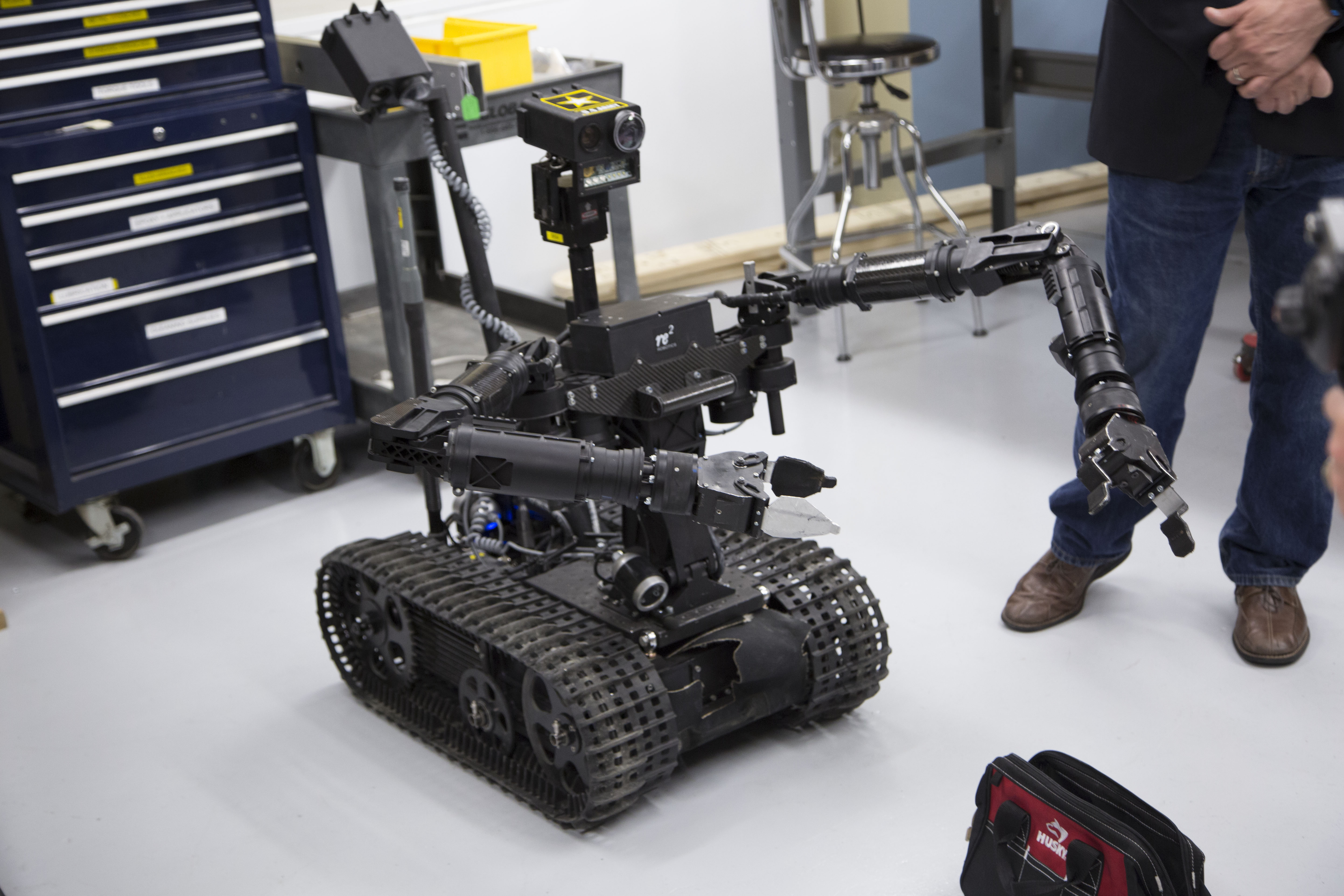 RE2 Robotics’ (pronounced “Re-Squared”) control scheme takes some getting used to. Each arm serves as an analog to the limbs on the military robot a few feet in front of me, but the control scheme and the exacting nature of every arm movement present a bit of a learning curve. After a few frustrating misses, however, I manage to save face in front of a room full of onlookers silently judging my robotic manipulation skills.