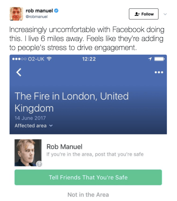 Being six miles away from a burning building in a city with a population of circa 8.5 million should not be a cause for worry — yet Facebook is actively encouraging users to worry by using emotive language (“your friends”) to nudge a public declaration of individual safety.