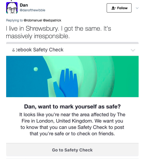Here’s the bottom line: London is a very large city. A blaze in a tower block is terrible, terrible news. It is also very, very unlikely to involve anyone who does not live in the building. Yet Facebook’s Safety Check algorithm is apparently unable to make anything approaching a sane assessment of relative risk.