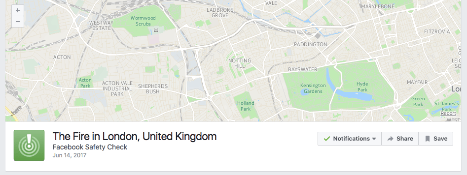 What does that mean? It means Facebook relies on the following formula for activating Safety Check: First, global crisis reporting agencies NC4 and iJET International must alert it that an incident has occurred and give the incident a title (in this case, presumably, “the fire in London”); and secondly there has to be an unspecified volume of Facebook posts about the incident in an unspecified area in the vicinity of the incident.