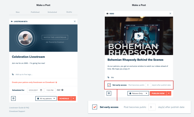 There’s also a slew of new content creation tools. The new Early Access feature lets creators post content just to fans who pay over a certain dollar amount per month, and set a ‘window’ before its publicly available on their Patreon. A partnership with Crowdcast lets creators log in with their Patreon account and broadcast livestreams just for paying fans, while Patreon foots the bandwidth bill.