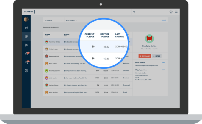 The new “Patreon Membership Engine” centers around the Patron Relationship Manger, the first CRM for pro content creators. It lets them sort patrons by how much they’ve paid or when they joined, and provides their email addresses — something YouTube, Facebook, Instagram, Snapchat, Twitter, and other platforms refuse to give creators.