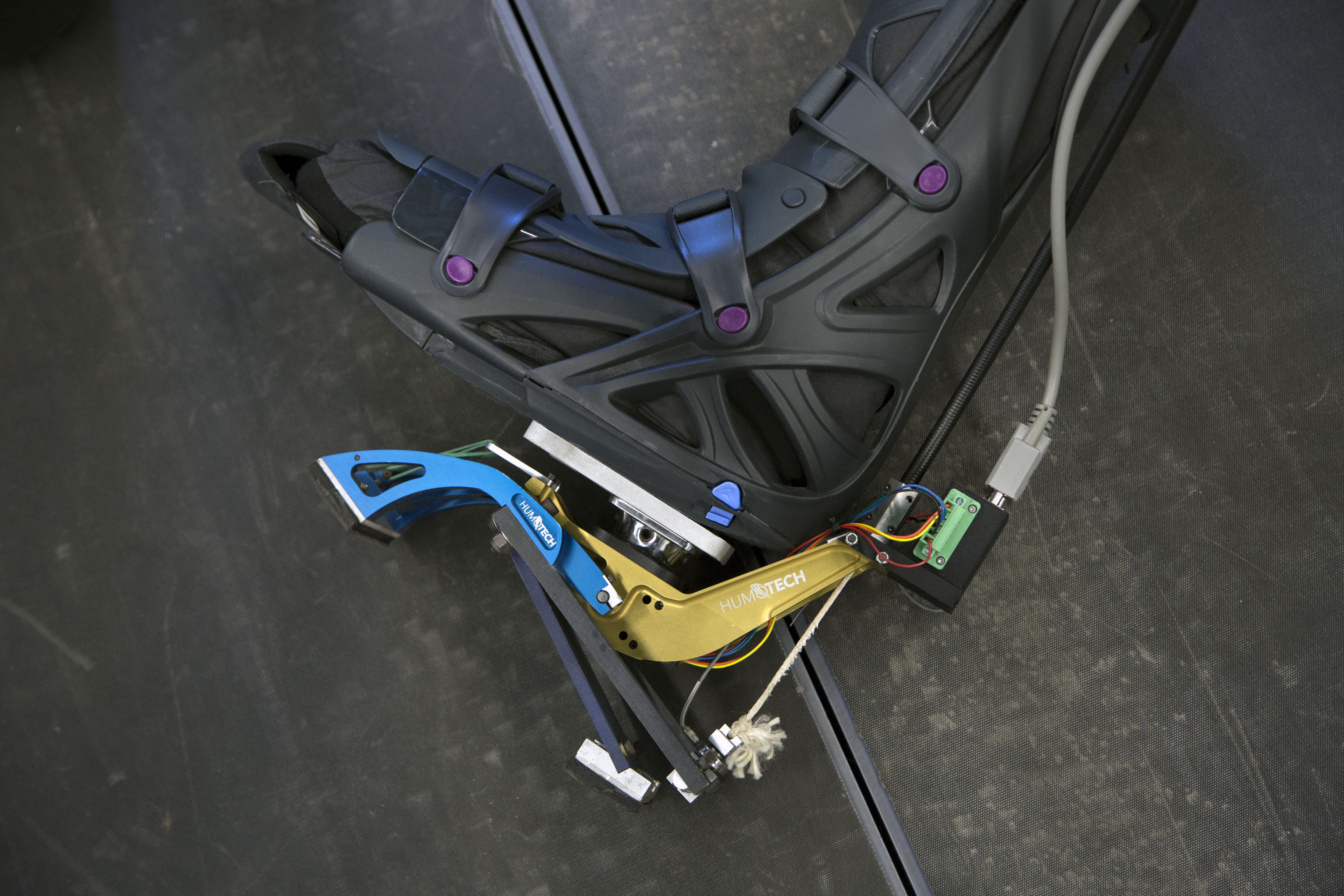 Stader is already hooked up and wired in when we arrive, with the ankle prosthesis connected to the socket on his right leg. The system is clearly not designed to disguise the fact that it’s a prosthetic. It’s fairly skeletal and minimalist. A single rod extends to an actuated base that more closely resembles a metal arch than a human foot. The whole thing is tethered by a series of wires that extend off the back, connected to an actuation unit that spins back and forth as he walks.