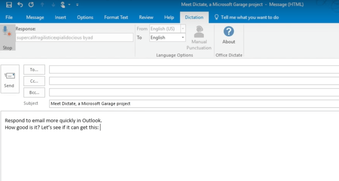 Once the add-in is installed, a new menu appears in the productivity app’s toolbar, allowing you to click to begin your dictation. In the demo, Dictate was shown handling the nonsense word “Supercalifragilisticexpialidocious,” as well as inputting text in simple email.