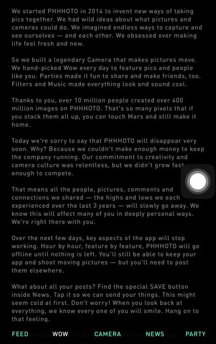 Here’s the entirety of Phhhoto’s statement to TechCrunch about getting copied and beaten by Instagram, and a screenshot of the message the team left for its users: