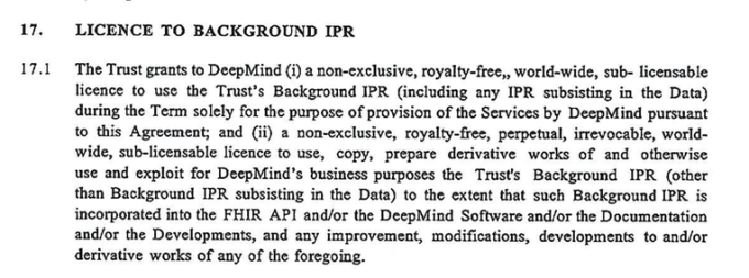 And there are what look like terms to purpose-limit how DeepMind can exploit any IP that emerges as a result of the collaboration — i.e. insights that can be deduced from the data, and/or derived as a result of the company being in a position to see how NHS detection moves through to treatment, for example.