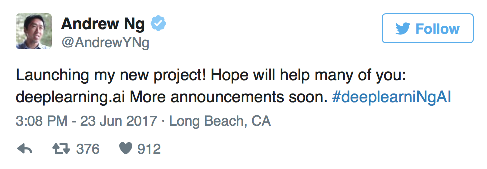 While this could technically encompass specialized hardware chips for deep learning, I’m more inclined to bet that it is a software solution given Ng’s expertise. Google CEO Sundar Pichai made a splash back at I/O last month when he discussed AutoML — the company’s research work to automate the design process of neural networks. If I was going to come up with a name for a company that would build on, and ultimately commercialize, this technology, it would be Deeplearning.ai.