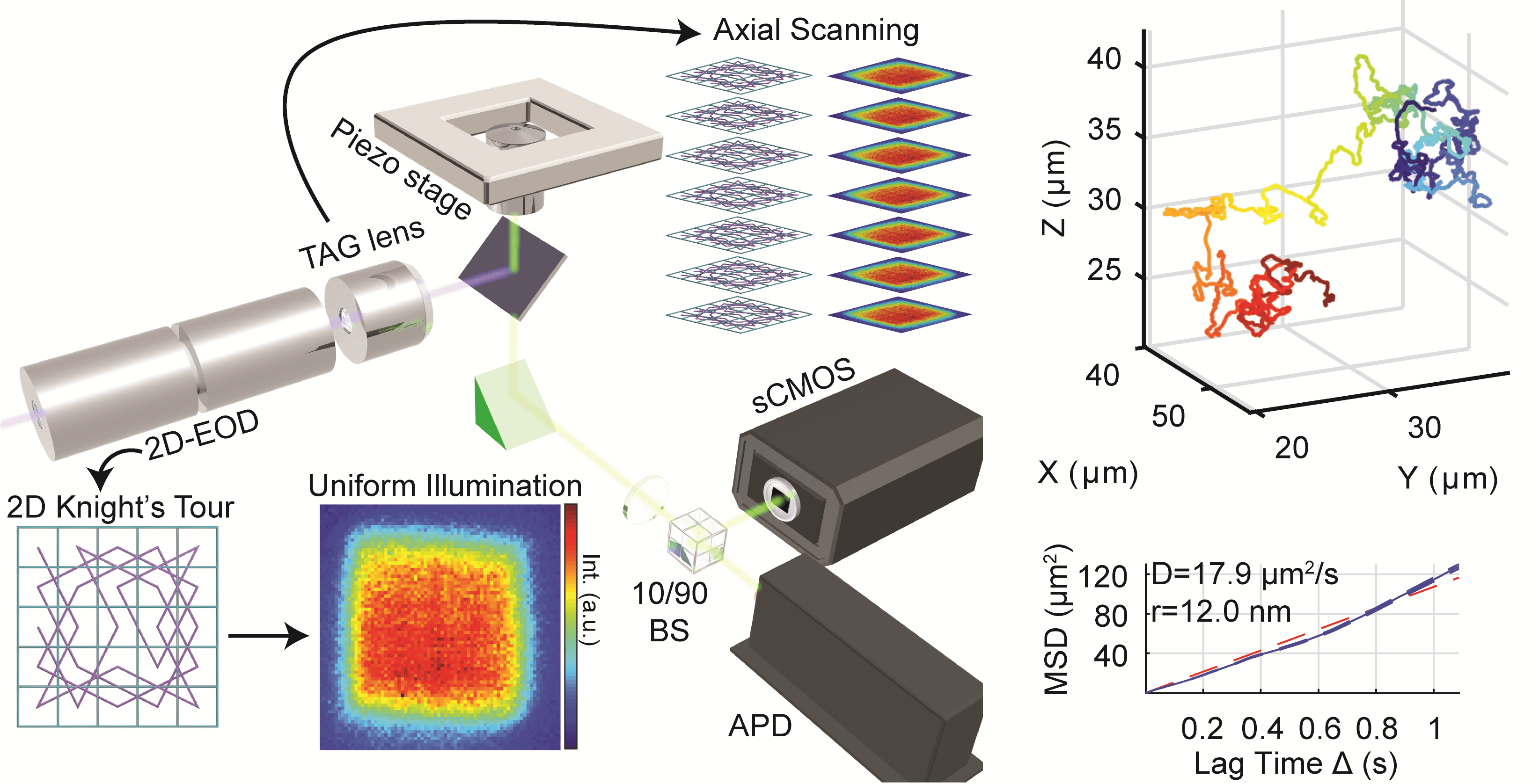 The system, designed by a team led by assistant professor Kevin Welsher, isn’t like a traditional microscope. Instead of magnifying an image using natural or augmented light, it scans a laser through a small volume repeatedly and from multiple angles. This illuminates special fluorescent particles, the positions of which can be tracked over time.