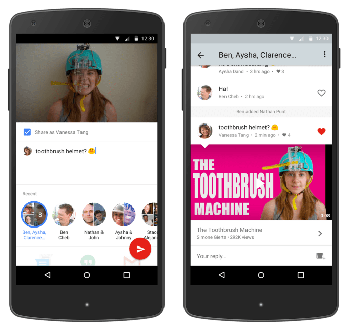 Instead of texting links to YouTube videos to friends, the idea is that you can start a chat session while still in YouTube. Friends can then reply with text or videos of their own, and even heart the comments they love. It wouldn’t be surprising to see YouTube expand this feature over time, to include other functionality, too – perhaps like the co-watching experience its testing today through its Uptime application.