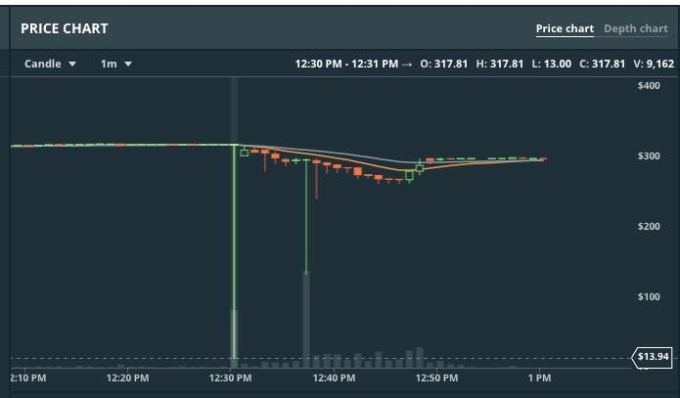 Within seconds the price of ETH crashed from ~$320 to as low as $0.10. While the price recovered quickly, the rapid price movement caused many traders to experience margin calls or stop loss orders, resulting in potentially severe losses.
