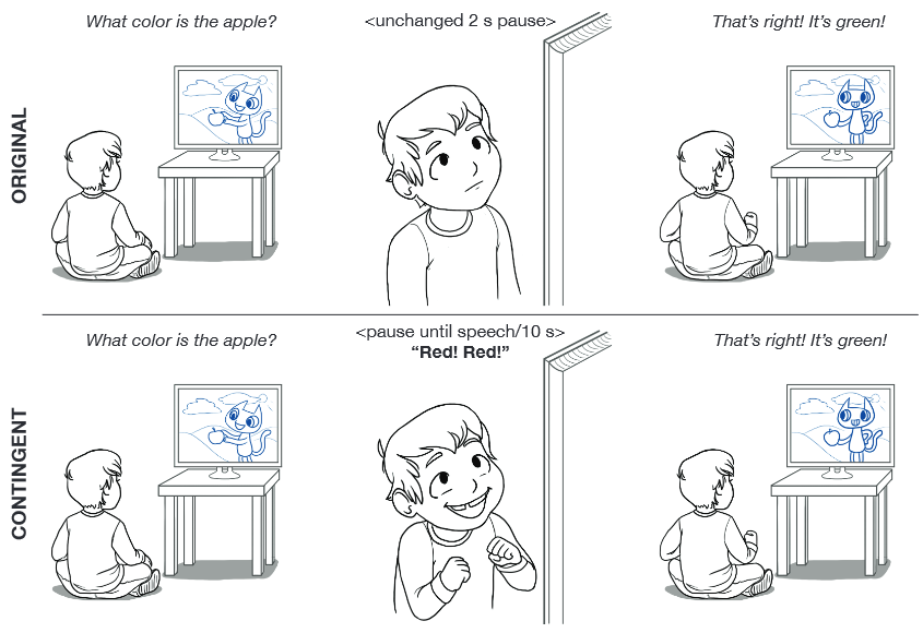 Instead of just waiting a couple of seconds during which a kid may or may not say anything, the show would wait (up to 10 seconds) for a response and then continue, or prompt them to answer again. Waiting and prompting definitely increased response rates, but there wasn’t much of an effect when feedback was included, for example pointing out a wrong answer.