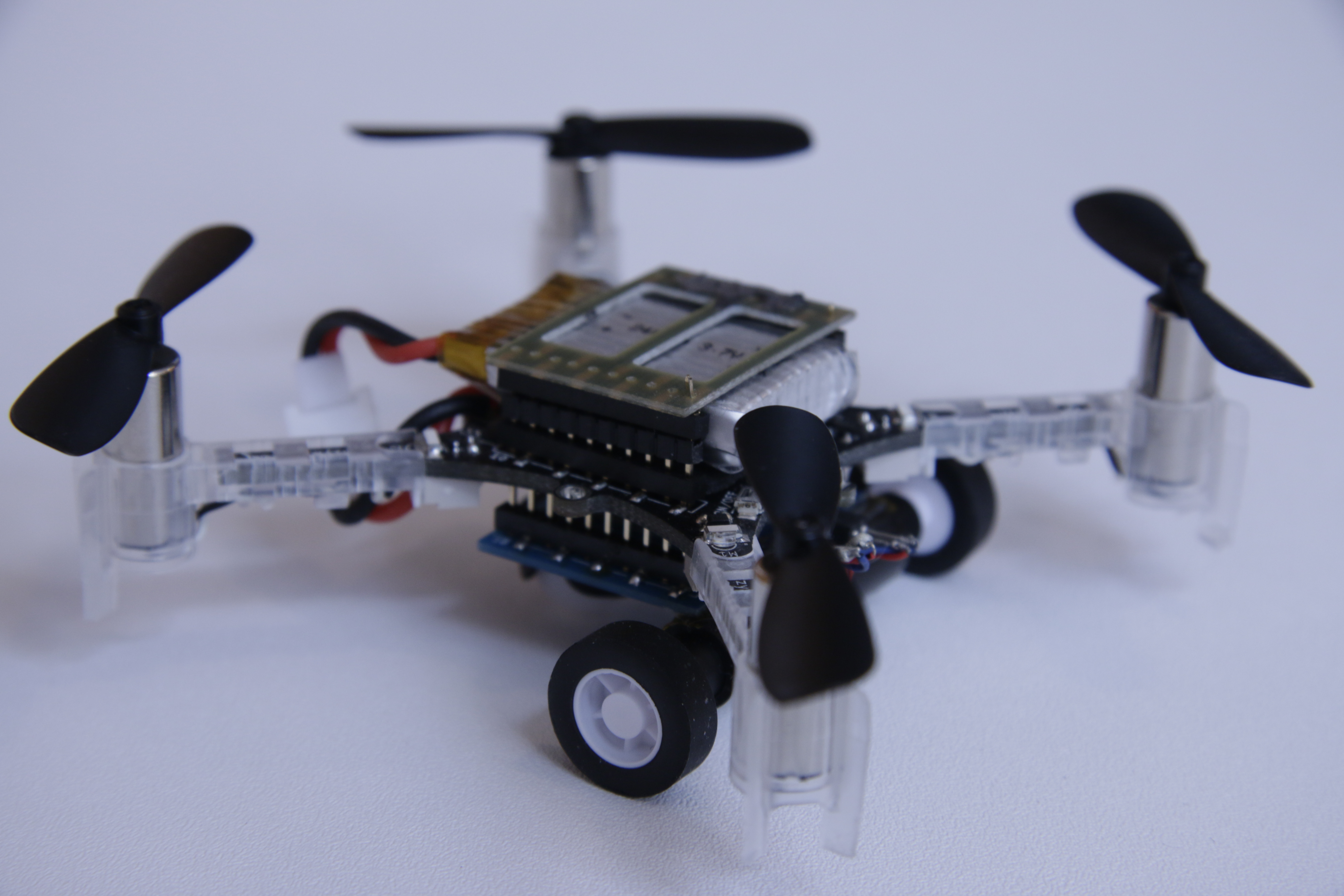Researchers at CSAIL created eight quadcopter drones that can also scoot along on wheels on the ground, with a max travel distance of up to 252 meters when driving, or 90 meters of pure flight. The team noted that many animals in nature will transition between flight and walking when convenient and necessary, including birds and insects, and designed their bots to do the same, negotiating both modes to maximize battery life.