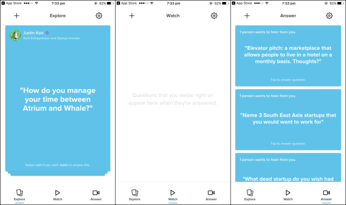 More widely, Whale has adopted a Tinder-style swipe mechanism to help you find questions that are interesting to you quickly and easily. The app serves up questions that have been asked to users you follow. Swiping right on a question indicates that you are interested in hearing the response and, if and when that video is posted, it will then show up in the ‘Watch’ tab of the app. A subtle option in the top-left corner of the ‘Explore’ (swipe) tab lets you find people to ask questions to.