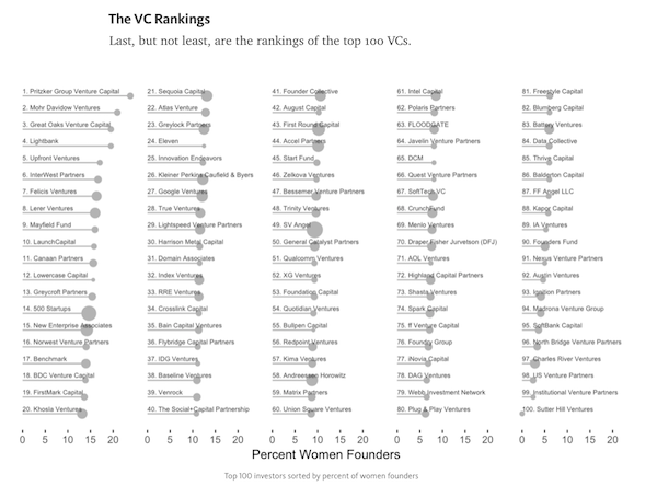 More recently reports have come out listing VC firms ranked by percentage of female founders where we’re usually listed in the top 5% nationally.