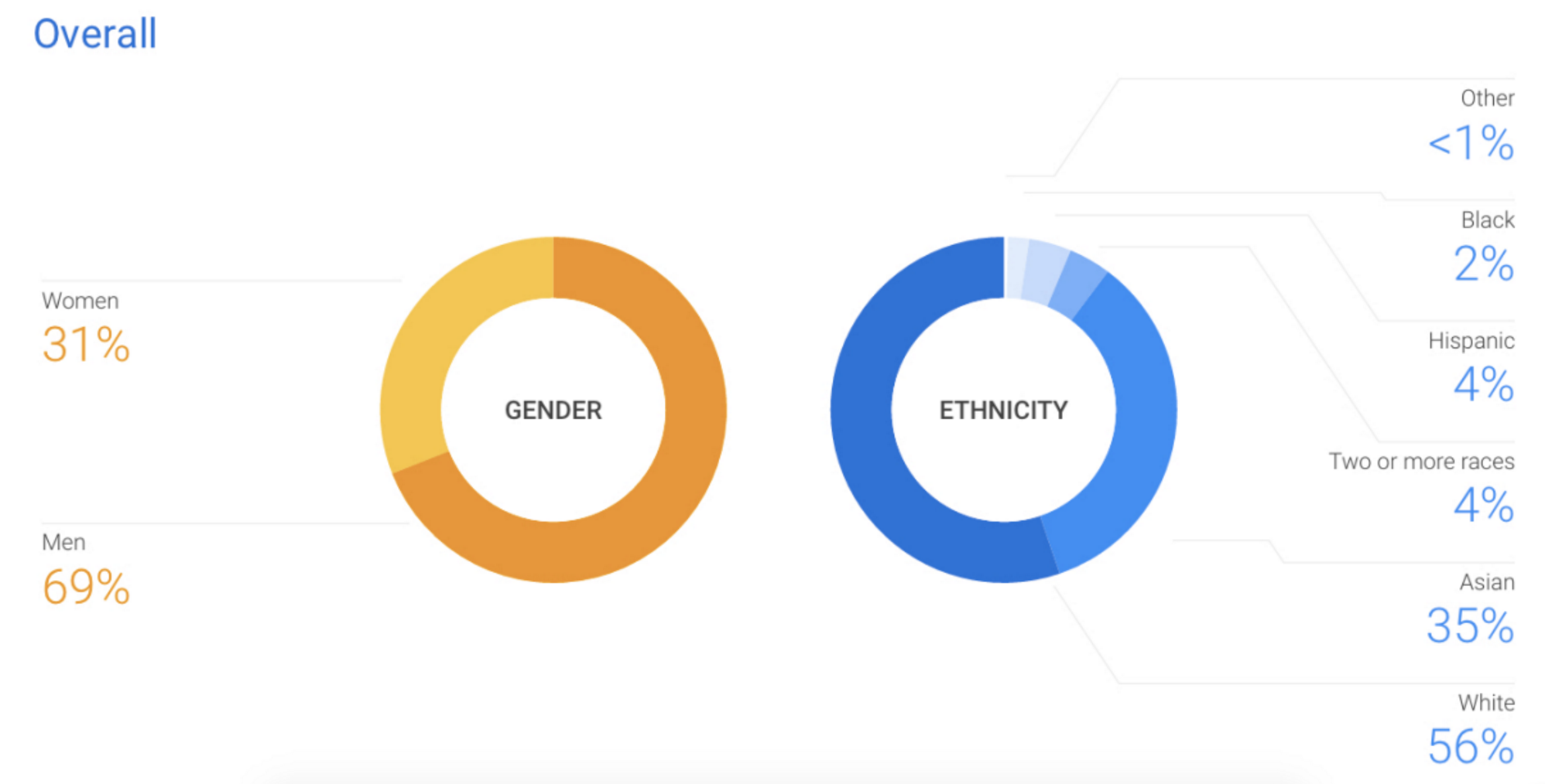 In Google’s 2016 diversity report we saw that overall representation of women went from 30 percent female in 2014 to 31 percent female in 2015. But the overall percentage of black and Hispanic people did not increase at all, with overall representation of blacks remaining at 2 percent and Hispanics remaining at 3 percent. In 2015, only 4 percent of Google’s hires were black and 5 percent of its hires were Hispanic.