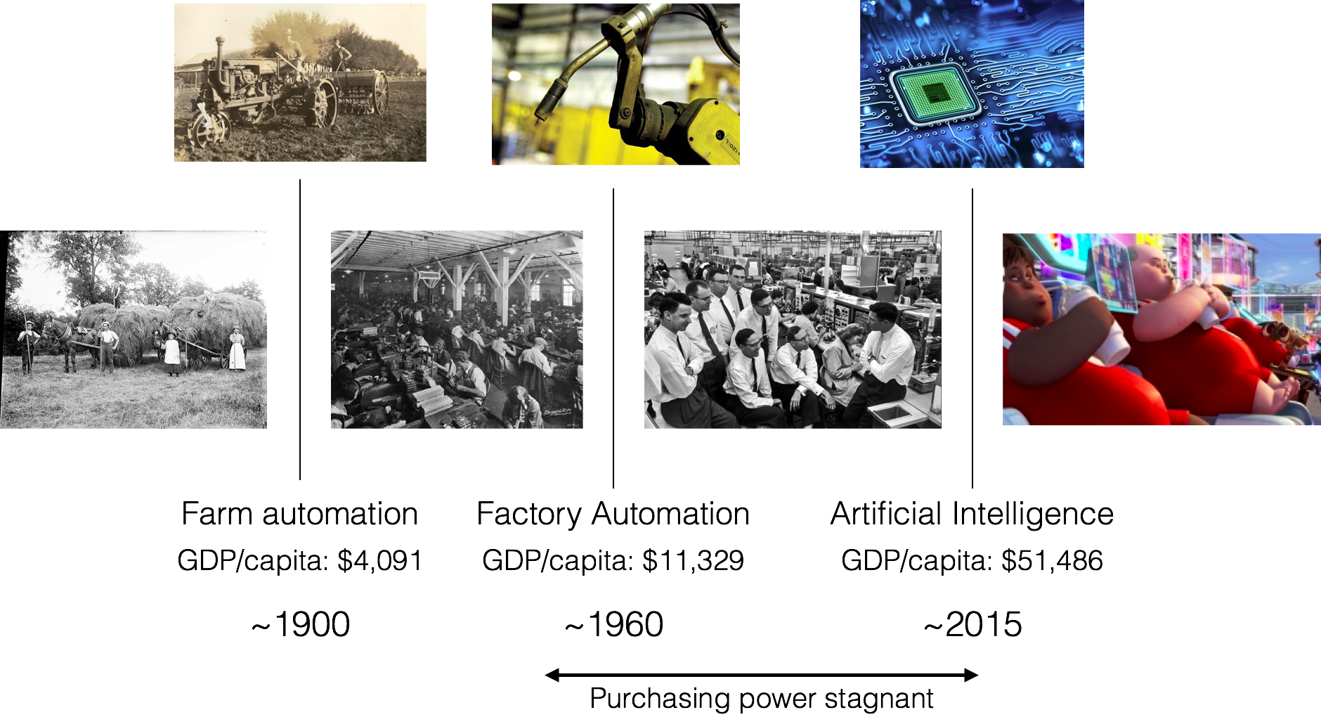 Throughout history, technology has created more, higher-quality employment for workers. Coupled with education, technology is the ultimate lever that allows people to produce more while “working” less and achieving a better quality of life. Tractors liberated farm workers from dreadful exposure to more productive factory work aided by tools. Automation of the factory work put people behind desks to exercise their minds and build even more advanced tools; namely, computers and robots. AI and deep learning will ease the onerous work around engineering and give humans more time to exercise their creativity. Per capita GDP numbers are from the U.S. Census expressed as Geary-Khamis dollars. The elephants in the room are 1) stagnating purchasing power as increased wages are offset by a higher cost of living, and 2) increasing ratio between the wages of the top 5 percent to the mean earners. I expect better regulation and education to lead to faster technology adoption, hence the creation of new jobs and abundance for everyone.