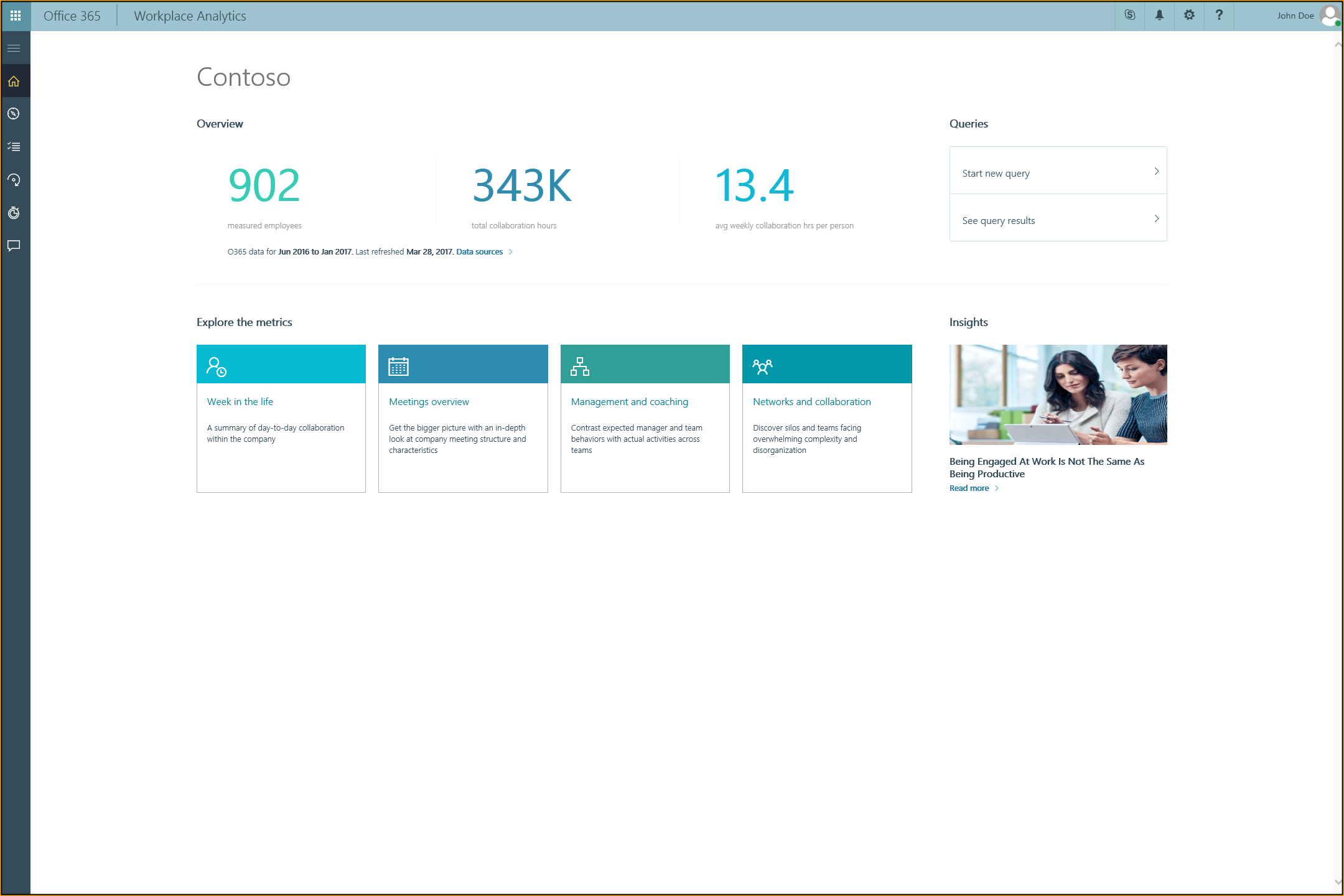 Microsoft is providing an overview dashboard inside Workplace Analytics and 4 standard views of organizational productivity including Week in the life, which looks at how the entire company spends time and collaborates; Meetings, which looks at the quantity and quality of time spent in meetings; Management and coaching, which measures how much one-on-one time employees are spending with their managers and Networks and collaboration, which looks at how employees are connecting across the company.