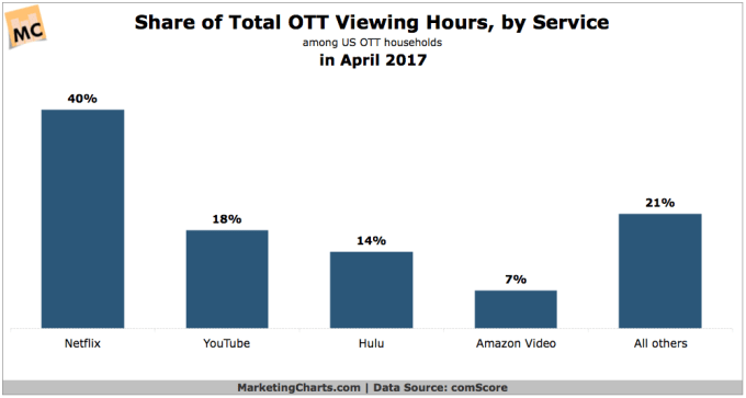 Netflix in April accounted for 40 percent of over-the-top viewing hours, compared with 18 percent for YouTube, 14 percent for Hulu, and 7 percent for Amazon Video. It also has the most monthly viewing days per household at 12.3 days.