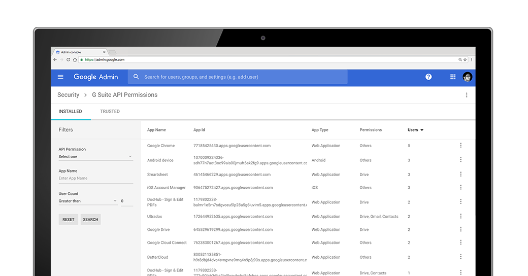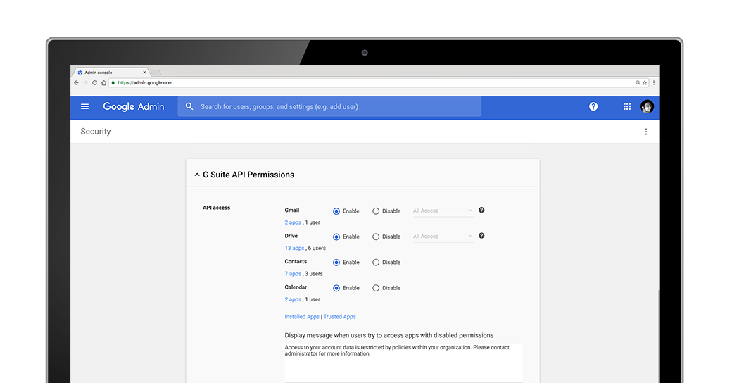 Once this is set up, users can simply authenticate over OAuth and authorize access to their G Suite data like before, and IT can sleep soundly knowing that only authorized apps can get to their data. Using this tool, admins can manage API access to Gmail, Drive, Calendar and Contacts.