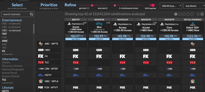 In addition, not all pay TV providers are available either – as the service seems to lean more towards helping consumers compare the live TV streaming options like Sling TV, DirecTV Now, PlayStation Vue, Hulu Live, YouTube TV, HBO Now, and others.