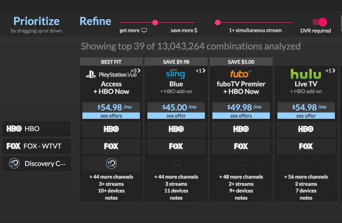 Across the top are other sliders and filters, allowing you to filter for only streaming services, for example, or choose which features you need (e.g. number of simultaneous streams, a DVR). You can can also drag a slider to prioritize whether you’re more concerned with cost savings or channel lineup, which will help better rank Suppose.tv’s recommendations.