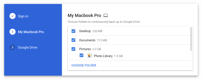 The new tool offers a simple user interface, where you’ll first sign into your Google account, then select the folders you want Google to continually back up to Google Drive. Because it’s replacing current users’ existing Google Drive installations, the tool will respect any current settings you’ve already specified on Mac and PC, Google explained last month, when it announced the tool was in the works.
