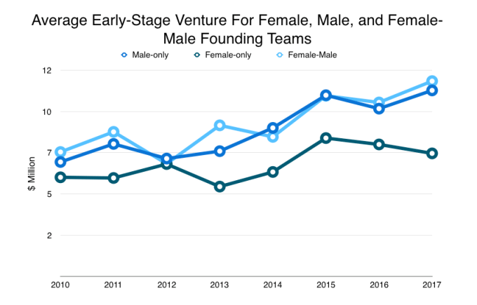 As the chart shows, there is a persistent gap between what male-only teams can raise, and what female-only teams can raise. Teams with founders that are both men and women land in the middle, a somewhat new trend that has become more pronounced since 2015.