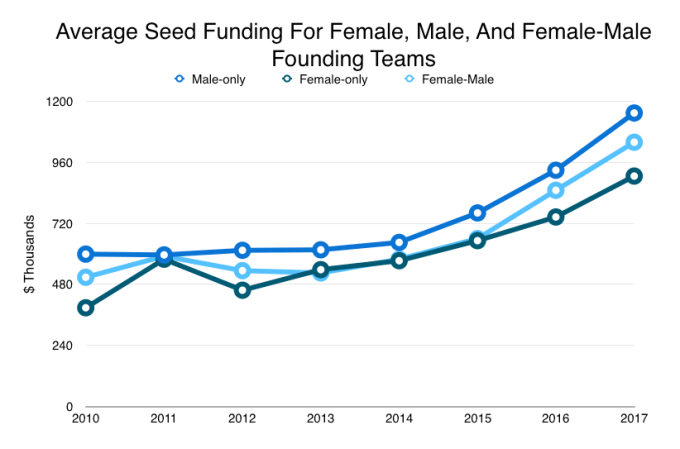 At the seed stage, we reviewed 2,400 rounds for female-only founding teams and 37,000 rounds for male-only founding teams. Since 2010, for seed-stage funding, women-only teams have raised on average $82 for every $100 a male founded team raises.