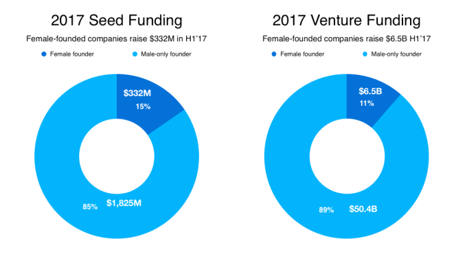 For the first two quarters in 2017, startups with a female founder raised $332 million in seed investment, or around 15 percent of all seed funding dollars. Approximately $6.5 billion has been invested in female-founded companies, representing more than 11 percent of all dollars invested in the first two quarters of 2017.