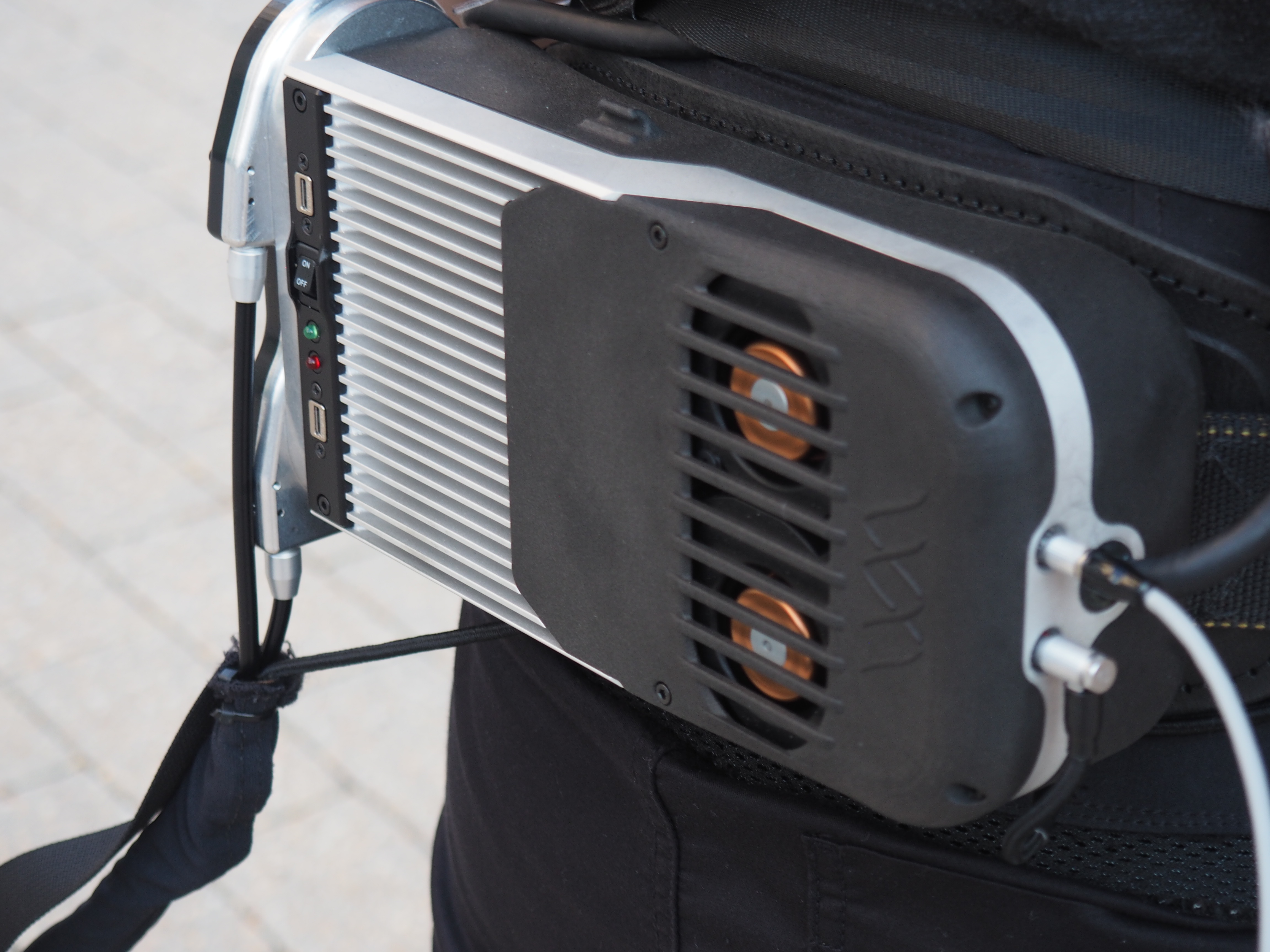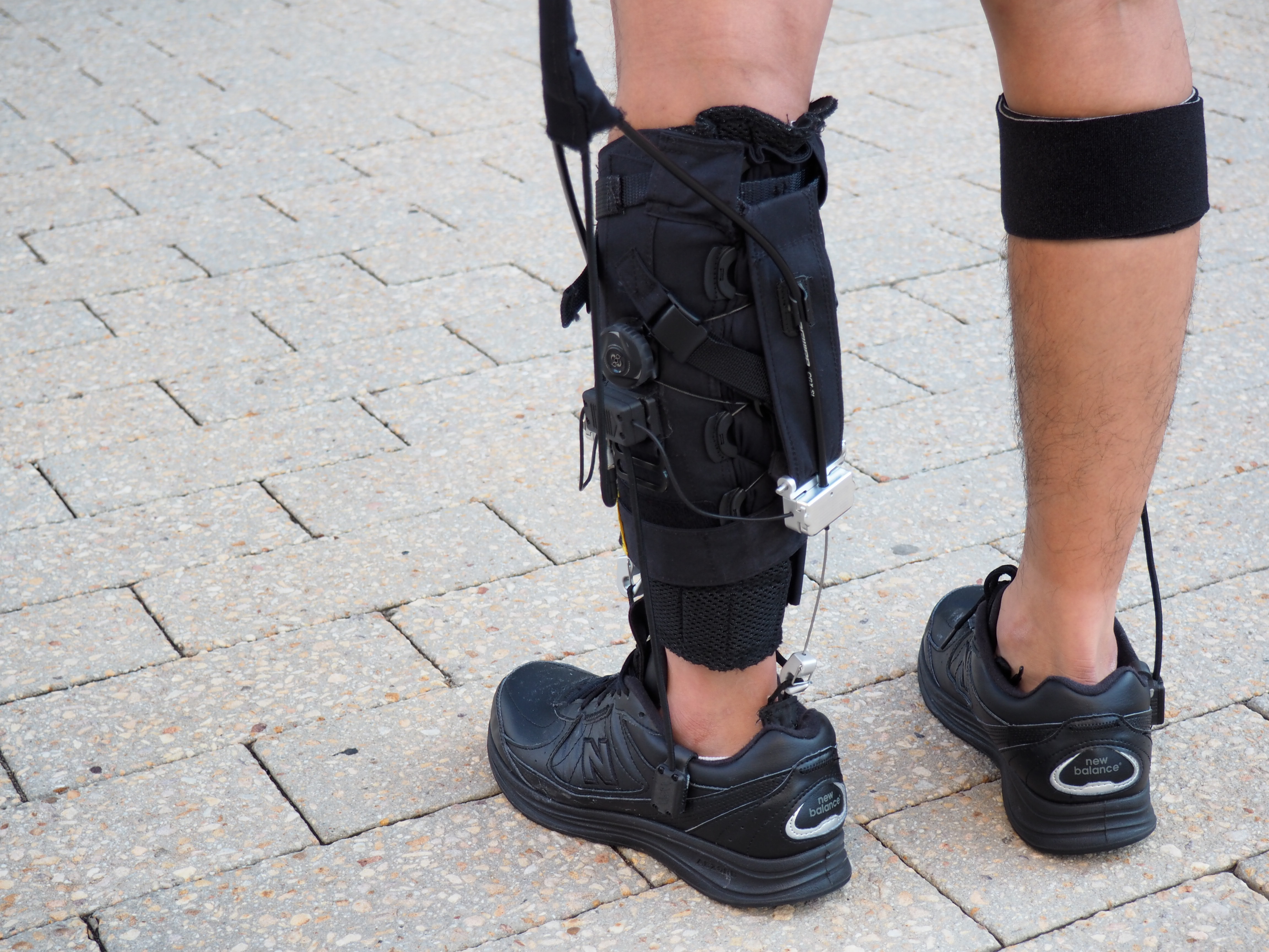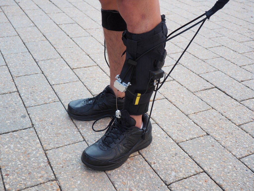 The device, now known as the Restore soft-suit, relies on a motor built into a waistband that controls a pair of cables that operate similarly to bicycle brakes, lifting a footplate in the shoe and moving the whole leg in the process. The unaffected leg, meanwhile, has sensors that measure the wearer’s gait while walking, syncing up the two legs’ movement. An able-bodied representative from Harvard was on-hand at the event, demonstrating how the system automatically adjusts when walking at different speeds.