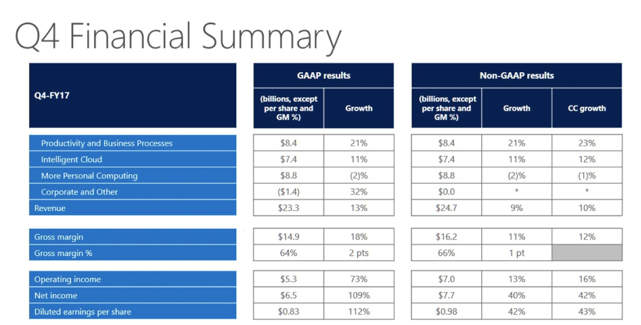 Following its longstanding tradition of reporting quarterly earnings for its fourth financial quarter of the year in July, Microsoft today announced non-GAAP revenue of $24.7 billion and GAAP earnings per share of $0.83 (and non-GAAP earnings per share of $0.98) for the last three months. Operating income was $7.0 billion non-GAAP.