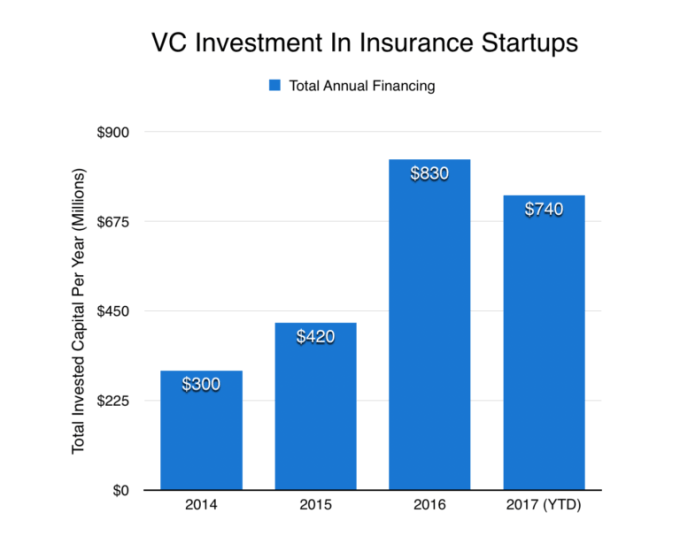 So far this year, insurance-focused startups (excluding the Asian continent*) have raised more than $700 million, almost as much as they raised in all of 2016, which was itself an especially busy year for the space. Much of the funding boom comes from big insurers themselves, who are backing and leading more rounds for insurance startups, as well as companies in related areas like financial services. In the chart below, we look at funding growth over the past four years: