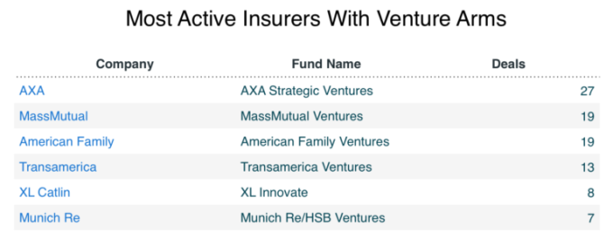 As mentioned, a sizeable chunk of the financing comes from insurance companies themselves, many of whom have dedicated venture arms. The most active by round count looks to be AXA Strategic Ventures, the VC arm of French multinational insurer AXA. The two-year-old fund has invested in two dozen companies over the past two years, including a $6.5 million round it led this month for QLoo, a celebrity-backed developer of AI-powered tools for mapping cultural tastes. MassMutual Ventures, the VC arm of insurance giant MassMutual, has also been keeping busy, backing 16 companies over the past three years. In the chart below we look at a few: