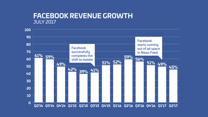 For reference, here’s how Facebook’s revenue growth has declined as it reaches maximum ad load:
