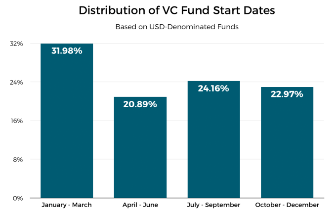 VC funds seem to follow the advice of the King from Alice in Wonderland: “Begin at the beginning….” There appears to be a seasonal aspect to fund start dates — a plurality of which fall in the first quarter of the year.